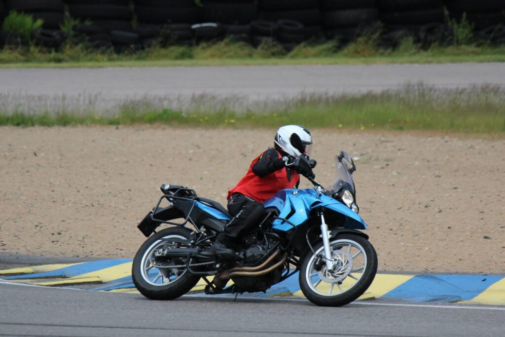 Om jag var nervös för min uppkörning, så var det absolut ingenting jämfört med hur det kändes innan jag kom ut på banan den där allra första gången! Trots noggrann genomgång i grupperna om hur allt skulle gå till och hur man skulle göra, så satt jag där på min motorcykel och kände mig fullständigt blank i skallen. Vad var det de hade sagt egentligen? Vad betydde alla flaggor och tecken som instruktören skulle kunna tänkas göra? Tänk om jag missar något? Hur ser banan ens ut? Hur fort ska jag köra? Måste jag köra fort? Tänk om jag gör bort mig och kör av och kanske ramlar? Frågorna snurrade men till slut bestämde jag mig för att det viktigaste ändå måste vara att absolut inte tappa bort instruktören! Följ bara efter och gör som instruktören gör.